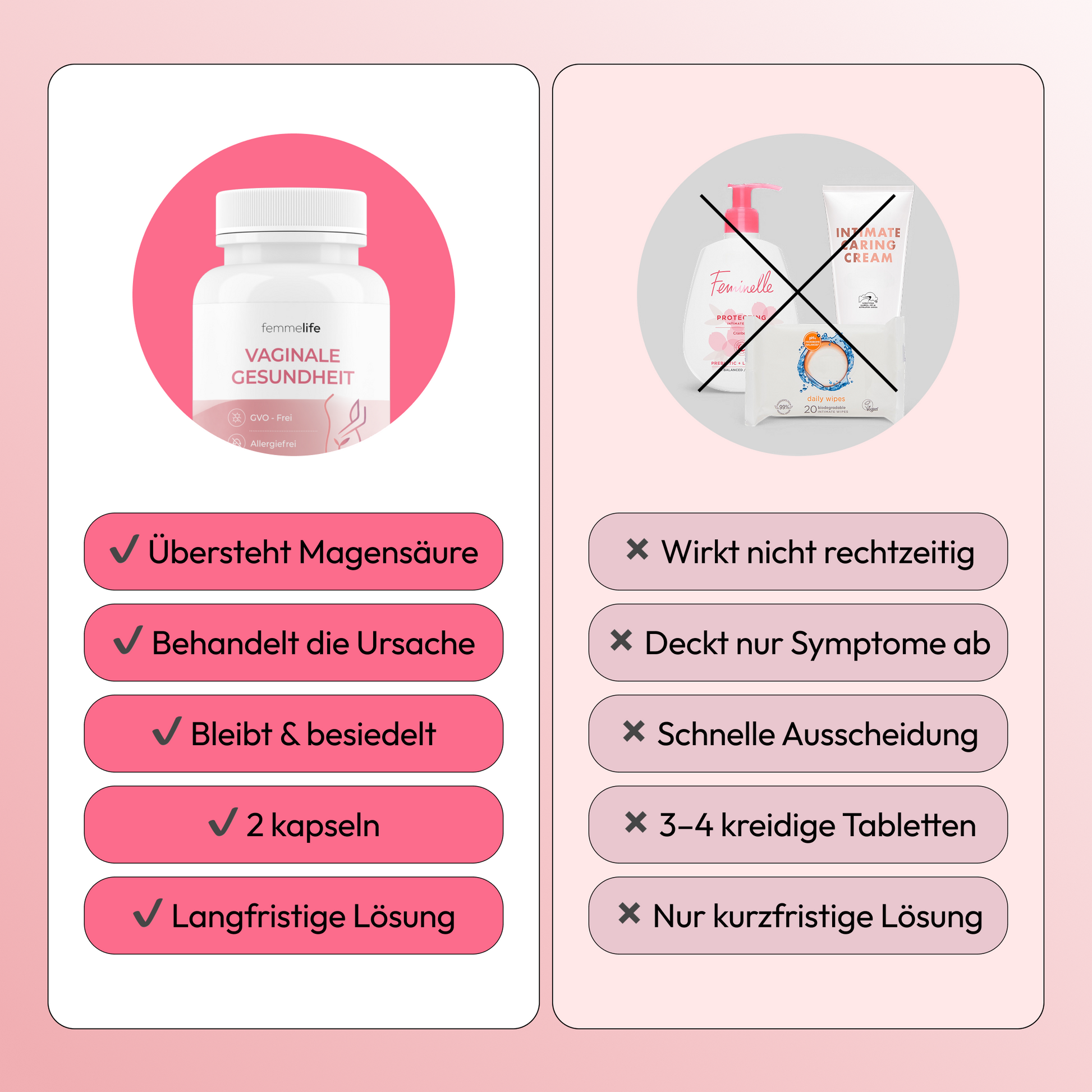 Femmelife wurde entwickelt, um das natürliche Gleichgewicht deiner Intimflora von innen heraus zu unterstützen.